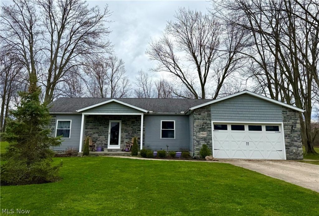 Beautifully Appointed and full of extra features, this 3-bedroom/2-bath open-style ranch is perfect for easy one-floor living. Quick access to Route 2 from this stone and vinyl ranch offering great curb appeal. Covered front porch to relax on summer evenings, Grand foyer entry to views of the open style floor plan and great room with accent wall highlighting the contemporary gas and glass fireplace, luxury vinyl flooring, show stopper kitchen with all stainless appliances, granite counters in the buffet area with glass door cabinets, Island/Breakfast bar with unique, thick glass top with grey swirls and crystal pendant lighting and knobs, (3 barstools will stay), glass tile backsplash, oversize SS sink, bay eating area with French doors. (Kitchen table can stay, it matches the cream cabinets), Walk-in pantry with obscure frosted door, Master suite with spa-style 16-foot tile bathroom, dry sauna, jetted tub, granite counter with bowl sink, walk-in glass shower and skylight for natural light. Frosted glass barn door that doubles as the 11' walk-in closet door and the master bath privacy door. 2 other carpeted bedrooms with fans plus a full tile and granite bath between them in a split layout from the primary suite. Huge laundry room with Maytag washer/dryer plus a work area with cabinets. Full unfinished basement that has plumbing for a third bath, glass block windows. Over 2200 sq ft of living space that sits on a 0.60 acre lot with stamped concrete patio plus gas line for your grill also a firepit. 2 car att. garage with epoxy flooring and opener, central air, security system, 12-month home warranty. This is a wonderful home, set up your showings now.